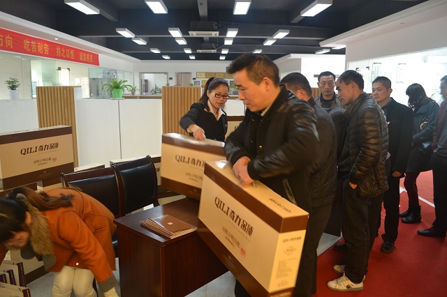 直供專車抵達奇力總部后,業主朋友們就迫不及待得趕往公司展廳參觀。而奇力的工作人員們早已整齊容裝,靜候來賓。引領盛澤朋友們領取豐厚而不菲的禮品后,漫步走進富麗堂皇的美式風尚第二季全新展廳,高貴奢華、精致典雅置身其中。來賓朋友們紛紛掏出手機、相機,記錄下奇力的精美產品與展廳。