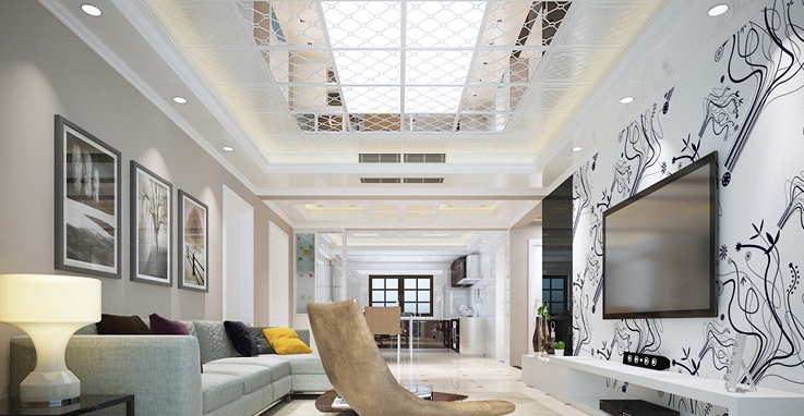 頂部扣板上令人神往的圓潤皎潔月盤,好似流轉的光陰,散逸出動人的風采。整體暖黃的布局,給客廳籠罩上一層溫馨氛圍。