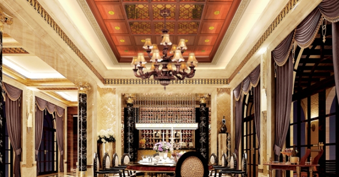古典韻味十足的中式吊頂,為餐廳空間增添一份素雅與愜意。棕色線條在頂部來去自如,打造出一個顏值爆表的餐廳空間。