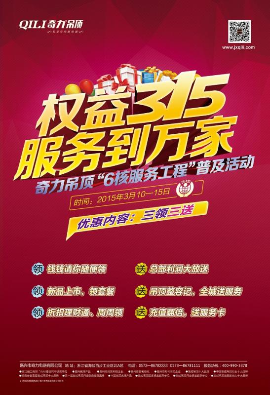 2015年3月15日,奇力吊頂,集成吊頂行業(yè)客廳吊頂領(lǐng)導(dǎo)者,暖風(fēng)電器領(lǐng)導(dǎo)者,國家與行業(yè)標(biāo)準(zhǔn)起草單位,在消費(fèi)者權(quán)益保護(hù)日這年度最重要的日子里,旗幟鮮明的推出了全國聯(lián)動(dòng)的“權(quán)益315 ...